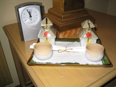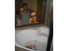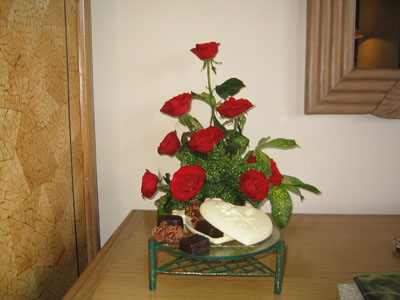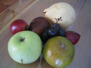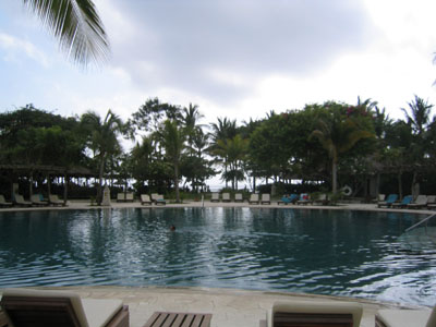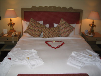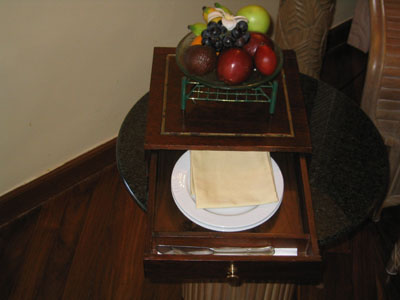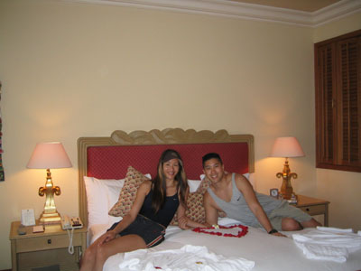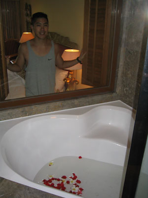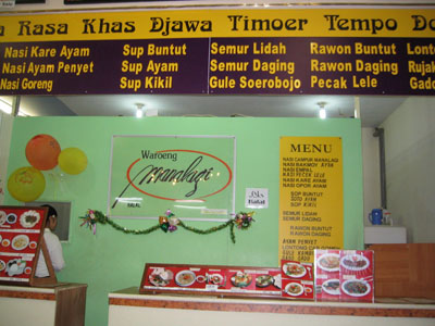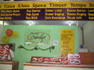 ![]() 2004 - Bali, Indonesia 20 November 2004 - 25 November 2004 Day 3: New digs and free fruit The next morning, we packed our bags and hauled them next door to the Sheraton Laguna Nusa Dua, rated among the top 3 by Tripadvisor. After having spent two nights at the Westin (next door) and two nights at the Sheraton, we think that Sheraton gives you a better return for your dollar by far. We had ants in both our first and second rooms at the Westin; the A/C did not work properly in the second room at the Westin. The staff and rooms at the Sheraton are excellent. Paul told them we were on our honeymoon and as a result, they made special arrangements for our room (pictured below) and pampered us with a large dish of heart-shaped chocolates, a vase of fresh roses, rose petals in the shape of a heart on the bed, rose petals in the bathtub, and a complimentary liquor nightcap for two. Now THAT is service. The Sheraton also offers 24 hour butler service with complementary freshly brewed coffee any time of the day (a plus by Paul's standards). Fresh fruit (oranges, apples, etc) are also available in the lobby (free of charge) all day/night. While patroling the halls one early morning, Paul spotted some innocent-looking mystery fruit sitting on a silver platter outside someone's doorway which he promptly swiped after making sure no one was around. Paul's pirated booty is pictured above. After enjoying Paul's free fruit for breakfast, we hopped onto the scooter and made our way towards Denpasar and found the Bali Mal Galeria, a huge mall located at the large roundabout on the outskirts of Kuta where we stopped to have a quick local-style lunch at a waroeng (food stall) located on the second floor food court. It was difficult trying to read the signs to pick our our lunch meal, but luckily for us, the waroeng had pictures of the dishes next to the menu (pic below), so we were able to point to what we felt like eating. To view a bigger version of the pictures below, simply click on the thumbnail.