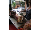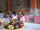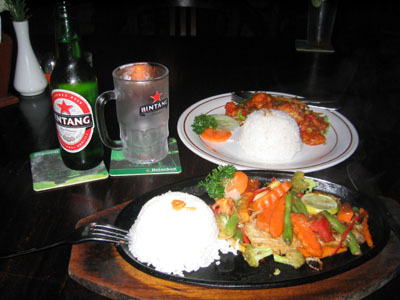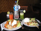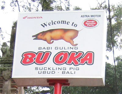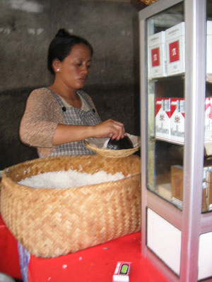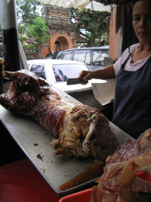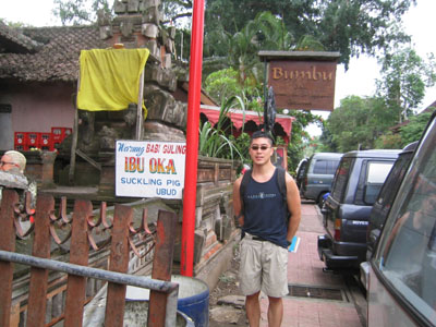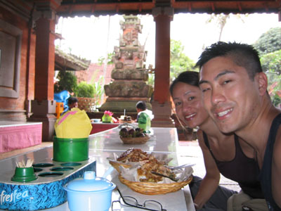 ![]() 2004 - Bali, Indonesia 20 November 2004 - 25 November 2004 Day 5 and Day 6: Exploring Ubud We decided to spend our last two days exploring the town of Ubud, a remarkable town in the middle of the island of Bali. For more than a century, it has been the island's preeminent centre for fine arts, dance and music. While it once was a haven for scruffy backpackers, cosmic seekers, artists and bohemians, Ubud is now a hot spot for literati, glitterati, art collectors and connoisseurs. After spending some time, walking through the quaint town of Ubud, we decided to eat lunch at a local warung/food stall, "Warung Babi Guling" (pic below). This warung in particular may be found in the mountain city of Ubud and is located opposite the Ubud Palace at the north end of the Monkey Forest Road. A definite favorite amongst locals, "Warung Babi Guling" came highly recommended both by our waiter at Made's Warung as well as by the Lonely Planet. The dish they are most famous for serving is Babi Guling, or spit-roasted suckling pig, which is also the best-known Balinese dish. As one can see pictured above, a mouth-watering order of "babi guling" comes with a side of rice while the pig itself is stuffed with a mixture of chopped herbs and local spices; the skin of the pig is anointed with diluted tumeric juice before roasting over charcoal. Since this was the only thing they served, ordering was easy and the pig: succulent. This was both the second best meal we had in Bali as well as the cheapest at $2 total for two people. After the delicious lunch, we headed over to the Sacred Monkey Forest where we spent the afternoon feeding the monkeys and running for shelter once a quick rainstorm hit. For dinner, we decided to eat at Dian Restaurant, located on the edge of "Central Ubud" at the southern end of the Monkey Forest Road. Dinner (pictured below) consisted of a healthy (yet delicious) vegetable and rice sizzling plate for Florence while Paul feasted on a spicy seafood (fish) dish followed by intermittent sips of ice-cold, refreshing Bintang Beer (also a local Balinese and tourist favorite). Dessert (pictured below) consisted of a warm and sweet traditional Balinese red bean rice-pudding dish topped-off with a freshly brewed, flavorfully strong cup of Balinese coffee. We enjoyed spending the day at Ubud so much that we decided to return the next day to purchase some trinkets for home and eat lunch (again) at Dian Restaurant. For lunch (pictured below), Florence decided to deviate from her favorite mie goreng and opted instead for yummy "nasi campur" (steamed rice topped with a little bit of everything...in this case: a tenderly marinated chicken drumstick, a healthy serving of vegetables, and sate). Florence also ordered a refreshing papaya fruit shake while Paul ordered a mixed sate rice dish and a freshly blended honeydew fruit shake. To view a bigger version of the pictures below, simply click on the thumbnail.