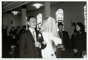 Papa Chan proudly escorts his youngest daughter down the aisle while his youngest daughter tries her hardest not to trip and fall on her dress.