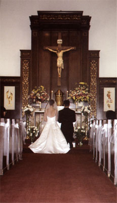 Florence somehow manages to avert disaster and makes it down the aisle in one piece, where she joins her future-husband-to-be in kneeling before the Altar.