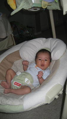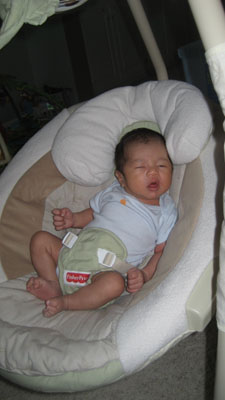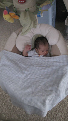 Rykan's favorite toy thus far is the papasan cradle swing.