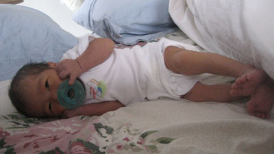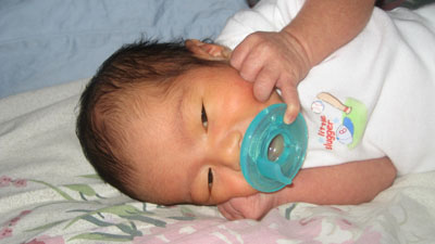Rykan kicked off the beginning of Week 2 getting to know his first, green Soothie binky.