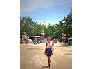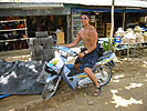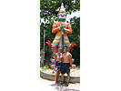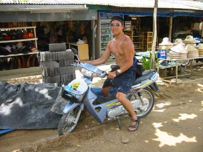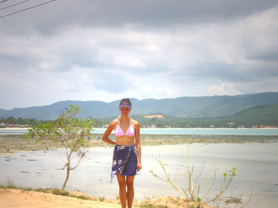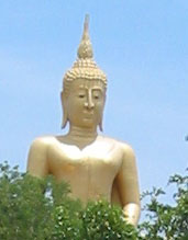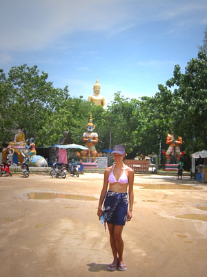 ![]() 2003 - Koh Sa Mui, Thailand 27 July 2003 - 01 August 2003 Big Buddah We set out in search of the Big Buddah (pictured above), one of Koh Sa Mui's landmarks, on the morning of July 29th and found the northern coast of the island (where the Big Buddah Resides) to be pretty sunny and hot. A signed posted next to the gated entrance leading into the Wat (temple/shrine) and ultimately to the base of the Big Golden Buddah statue itself informed visitors about the history of the area. Unfortunately for us, we noticed an additional sign requesting that visitors be in "polite" attire and since both of us were in our bathing suits at the time, we spent a quick fifteen to twenty minutes taking snapshots of smaller statues in the area and perusing the small shops and restaurants nearby before heading off in our scooter to a cooler part of the island. On our way out, Paul noticed that we could see the Zazen Bungalows, our resort, from the Big Buddah, so we stopped off to take a photo (below) of Bohput Beach in the background. If you look really closely, you can see the red/orange roofs that the Zazen Bungalows are so well-known for. We soon found ourselves enjoying a taro popsicle (only 10 baht) while sitting in the cool shade of a 7-11 store. These purple and white colored taro popsicles turned out to be one of our favorite treats on the road when we found ourselves in need of something sweet and refreshing. To view a bigger version of the pictures below, simply click on the thumbnail.