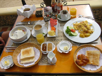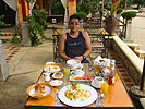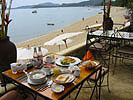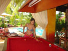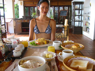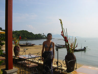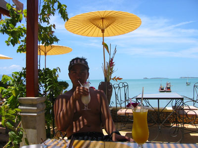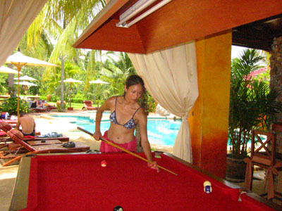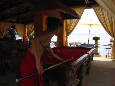 ![]() 2003 - Koh Sa Mui, Thailand 27 July 2003 - 01 August 2003 Zazen Bungalows Resort Each morning, we awoke bright and early in eager anticipation of the different kinds of adventures we'd be experiencing later that afternoon. Our complimentary Zazens breakfast (pictured above) was the first event we looked forward to each morning and was a perfect way to kick-off our day. After breakfast, we'd play a round of pool (pictured below) where Paul beat Florence each and every time (much to Florence's chagrin, since Paul's no Janet Lee) and finish up by taking a stroll along the serene and golden-sanded Bophut Beach towards the Fisherman's Village (east of Zazen). After our afternoon explorations, we'd come back to Zazen and lounge around its tropical pool (where Paul swam 10 laps each day) and (if time permitted) took in a relaxing snack before heading off to dinner. To view a bigger version of the pictures below, simply click on the thumbnail.