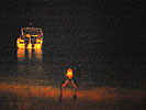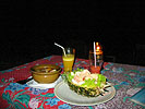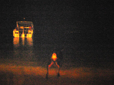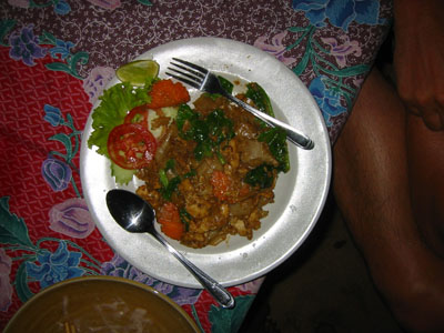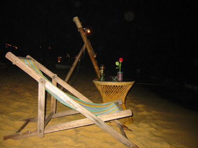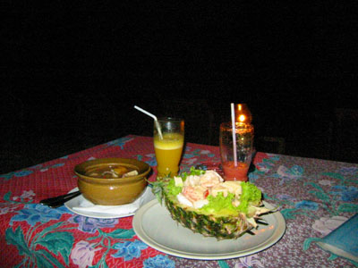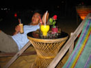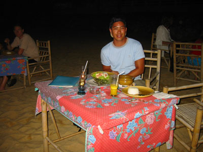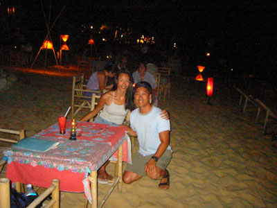 ![]() 2003 - Koh Sa Mui, Thailand 27 July 2003 - 01 August 2003 Maenam We decided to go all-out for dinner, our last night in Koh Sa Mui and headed over to Maenam for a serene, candlelit, fresh seafood dinner on the beach. We lounged on the beach listened to the gentle waves lapping at the shore, and watched a thunder and lightening show in the distance while waiting for our dinner to arrive. We shared our view with a local Thai dog (pictured below) that seemed fascinated by the lightening show which would light up the sky in the distance (every 10-15 minutes) over Koh Phangan. Koh Sa Mui is an island slightly south of Koh Phangan, famous for its monthly full moon parties. To get from Koh Sa Mui to Koh Phangan, one simply needs to hop on a ferry boat, which is an hour's ride from Bo Phut and an hour and a half ride from Nathon Pier. Dinner consisted of one large, fresh mango smoothy (for Florence), iced coffee (for Paul), iced strawberry smoothy (shared) tom yum gai, pad see ew, and a seafood-pineapple rice dish. The pad see ew was the best dish (can't go wrong with one), with the tom yum gai placing a close second. The seafood-pineapple rice dish had a surprise ingredient, mayonaise, which Paul cared very little for. Other ingredients included ample pineapple and onion cubes (Florence mistakenly thought the onion cubes were pineapple cubes on more than one occasion during the course of the meal), and about 3 or 4 pieces of shrimp (which is why the dish had the words "seafood" in its title). Needlenss to say, this meal turned out to be slightly less pleasant than we had originally anticipated, but luckily for us, a light sprinkling of rain ensued towards the end of our meal. This light shower initiated frantic chaos as a response and signalled to us that our seafood-on-the-beach-meal was over. In the flurry of frenzy and excitement, our waiter made a mistake on our bill, which ultimately benefited us and suited Paul just fine. We payed the price requested for our meal, scootered back to our resort and spent the rest of our evening enjoying each other's company while relaxing in our warm, comfortale, dry bed and catching up on the adventures of Harry Potter. To view a bigger version of the pictures below, simply click on the thumbnail.