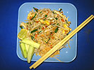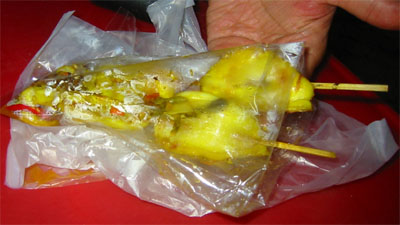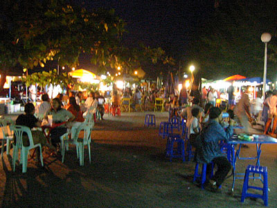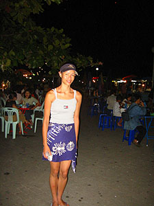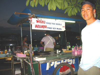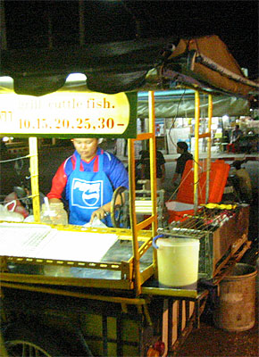 ![]() 2003 - Koh Sa Mui, Thailand 27 July 2003 - 01 August 2003 Nathon Pier One of our most inexpensive dinners (a little over $1.00 total for both of us together) in Koh Sa Mui was spent during a visit to Nathon's infamous Night Market at the pier (pictured above). We eagerly sampled Nathon's wonderfully delicious flavours and spices and were full before we knew it. Items sampled include Fried Thai noodles, Curry Egg and Craw, and Spicy Barbequed Squid. Quite unexpectedly, we found ourselves sharing our meal with a rather friendly Thai local (pictured below), who followed us around as we walked from food vendor to vendor. We didn't mind the added company and sneaked a quick snapshot of the local when he wasn't looking to document our new found friend. To view a bigger version of the pictures below, simply click on the thumbnail.
